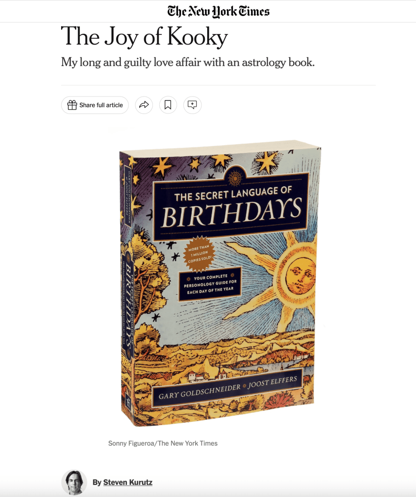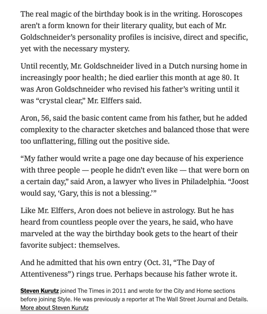 Below are some excerpts from a New York Times article by Steven Kurutz on The Secret Language of Birthdays (written after my father’s passing on the books’s 25th anniversary) that describe part of my role in creating the book, followed by my thoughts on what I’m most fond of in regard to the book.