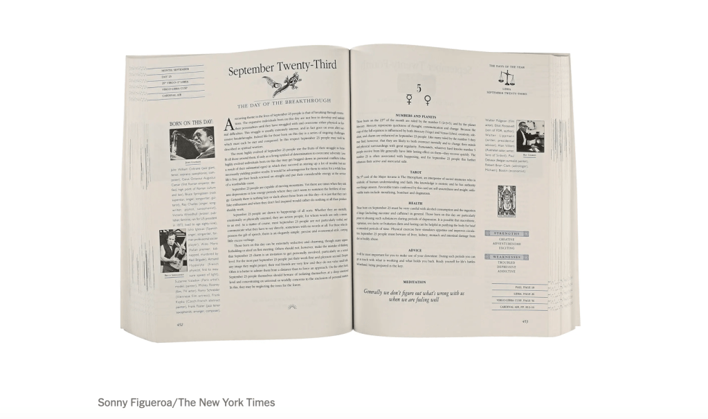 This highly accessible astrology book, which only requires one to know the day of the year on which one was born, was an instant hit, as people would begin by generally looking up their day in the bookstore, and then move on to family, close friends, romantic partners . . . and would soon bring the book home with them, where it would become a conversation starter at parties and bring people together in discussing their personalities. Libraries could not keep it in their collections, as it was invariably stolen.